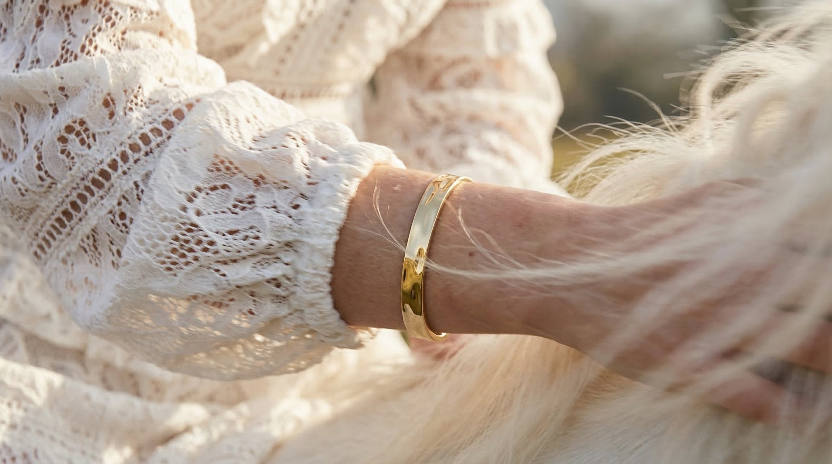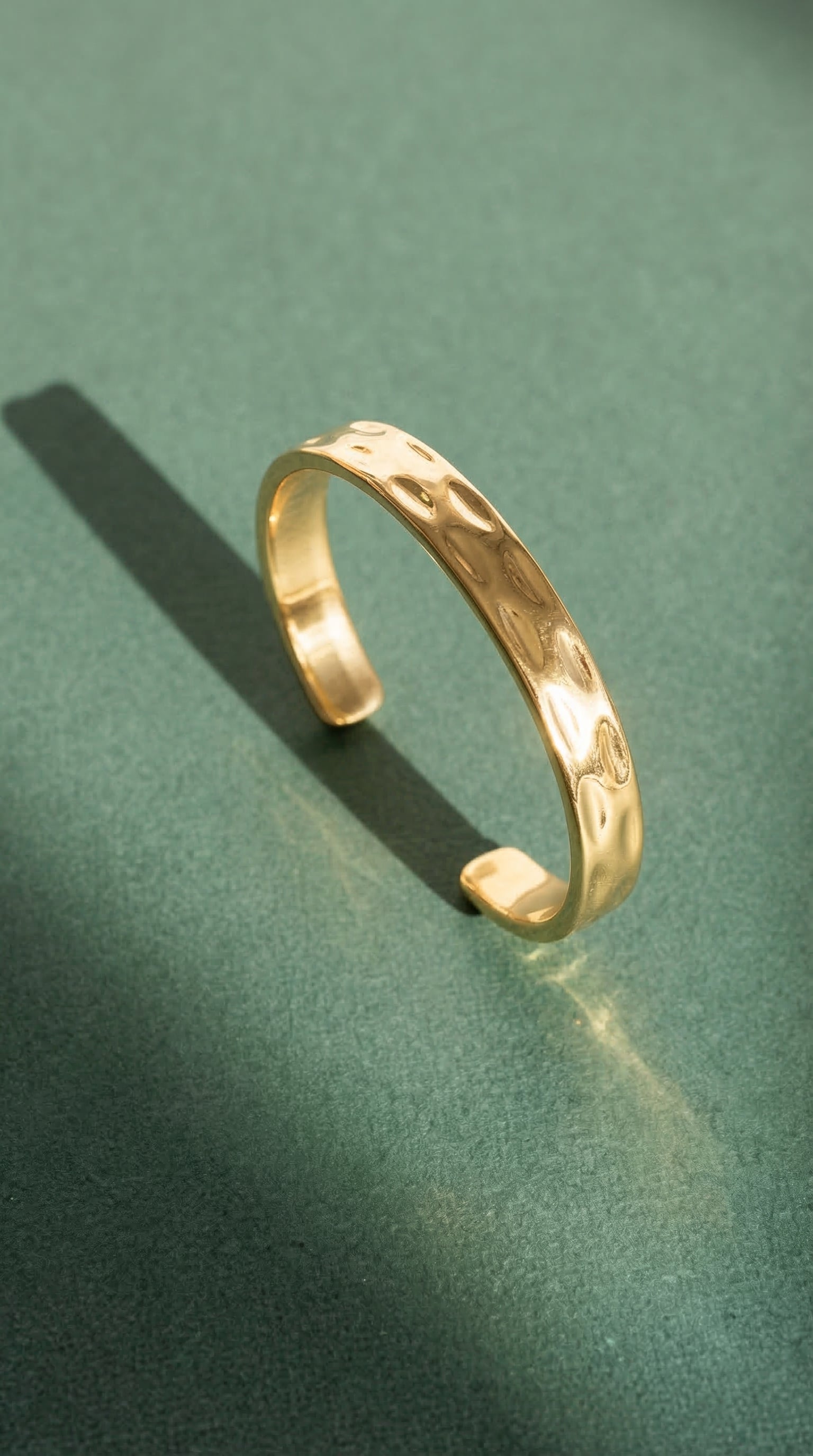 The Calvero Bracelet features a subtly hammered surface that catches light from every angle. A statement of quiet confidence — bold in detail, minimal in form.